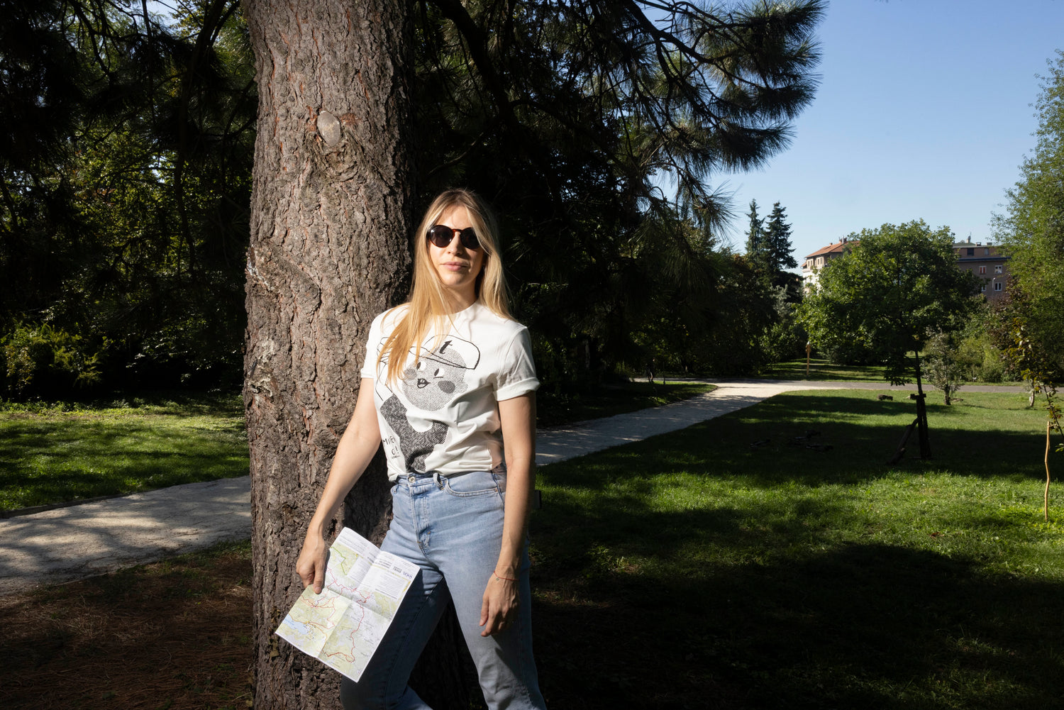 Klasszikus szabású, organikus pamut póló. Kézzel és vízbázisú szitanyomással készült egyedi mintával mindkét oldalán.