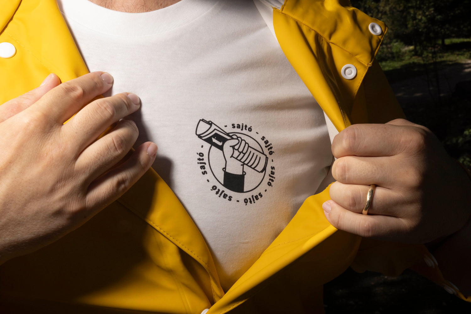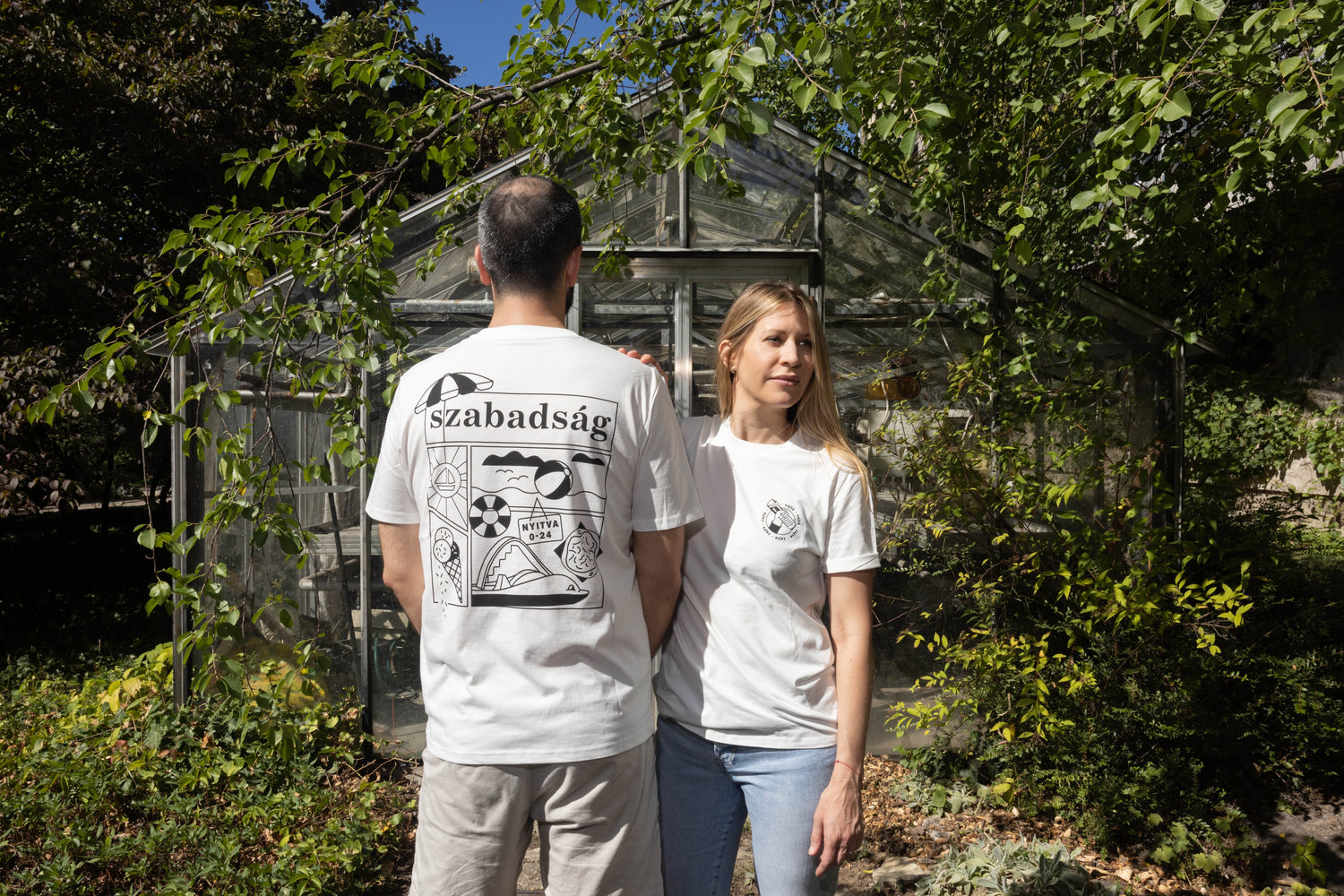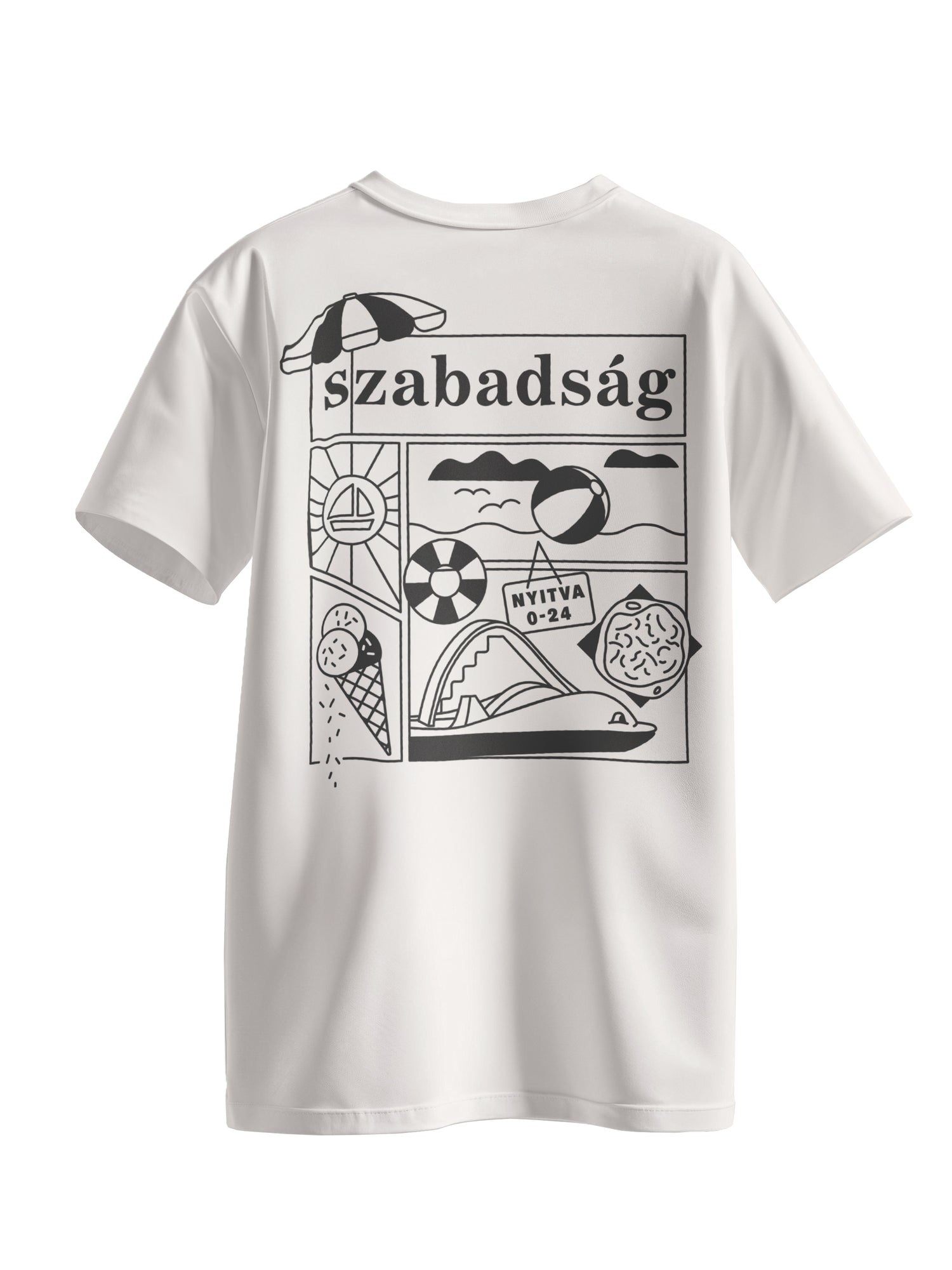Klasszikus szabású, organikus pamut póló. Kézzel és vízbázisú szitanyomással készült egyedi mintával mindkét oldalán.